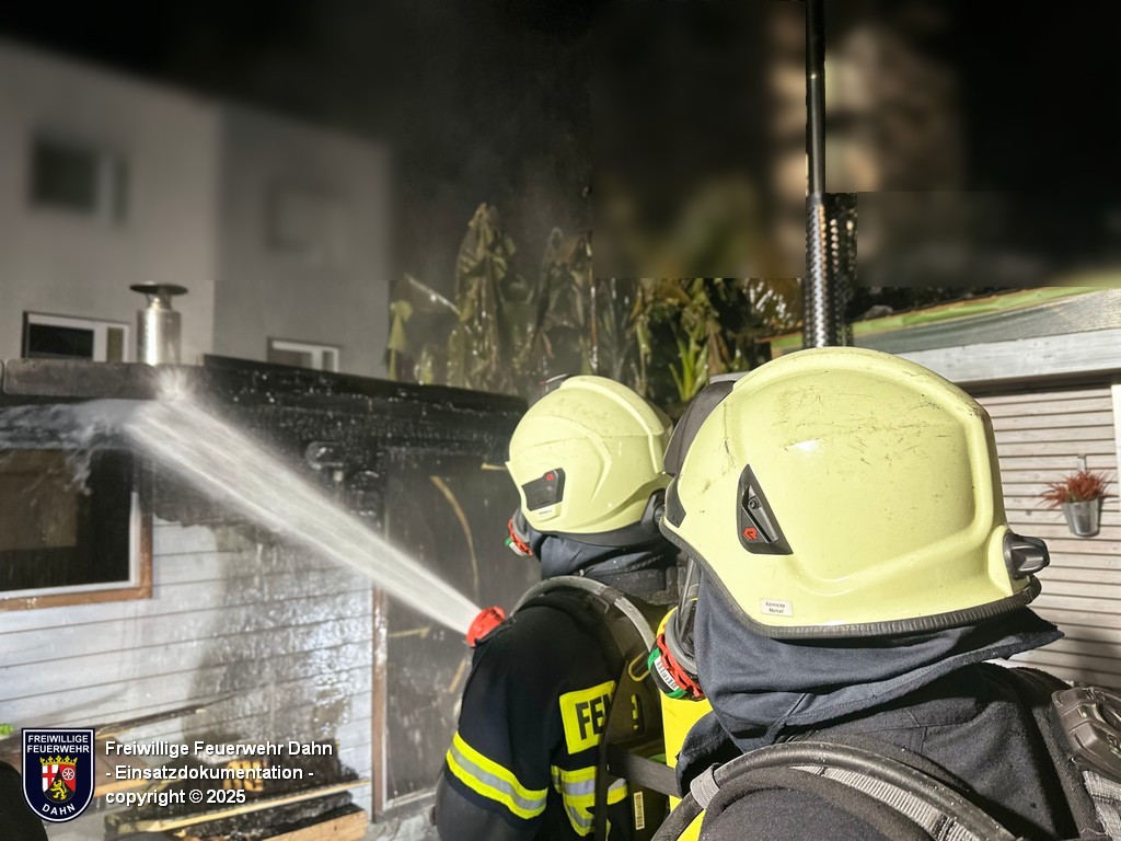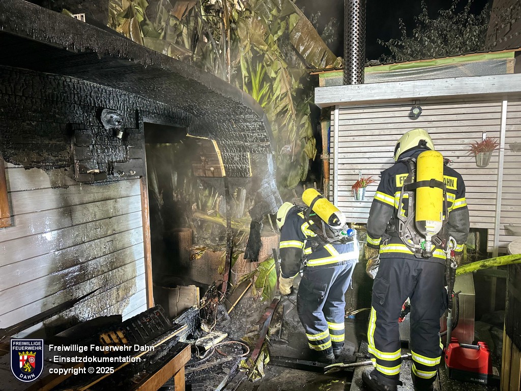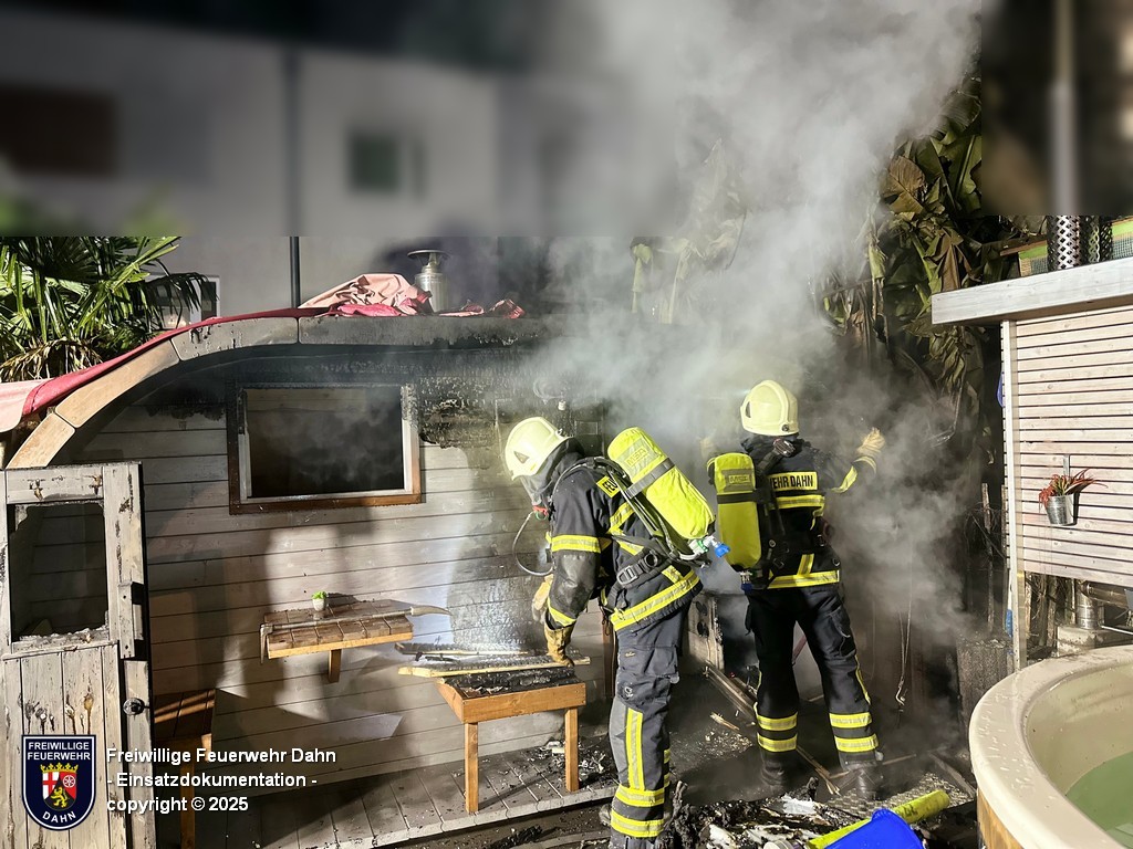 Am Freitagabend kurz nach dem wöchentlichen Übungsabend piepten kurz vor Mitternacht die digitalen Funkmeldeempfänger der Feuerwehrangehörigen Erfweiler und Dahn. Gemeldet wurde der Brand einer neben einem Wohnhaus stehenden Sauna in Dahn. Diese Meldung wurde durch die ersteintreffenden Kräfte nach der Erkundung bestätigt. Nachdem eine lange Schlauchleitung in den rückwärtigen Bereich des Grundstückes zur Sauna verlegt war, konnten zwei Atemschutztrupps unter schwerem Atemschutz den Brand bekämpfen. Um letzte Glutnester abzulöschen mussten mit einer Rettungssäge Teile der Boden-Holzverkleidung entfernt werden.
