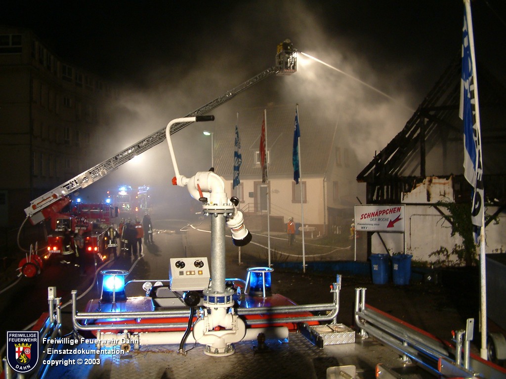 Bei Eintreffen des Einsatzleiters mit seinem PKW brannte die rechte Hälfte einer Scheune lichterloh. Er weckte die noch schlafenden Bewohner eines angrenzenden Wohnhauses, die ihre vor der Scheune abgestellten PKW in Sicherheit brachten. Als kurz darauf das erste Löschfahrzeug die Einsatzstelle erreichte, hatte die Scheune durchgezündet und stand in voller Länge im Vollbrand. Die ersten Einsatzkräfte nahmen ein B-Rohr zur Brandbekämpfung und ein C-Rohr zur Abschirmung eines Nachbargebäudes vor. Mit dem Monitor des TLF 16/45 wurde eine angrenzende KFZ-Werkstatt vor den Flammen geschützt. Parallel hierzu konnten drei noch in der Scheune befindliche, äußerst aufgebrachte Pferde vor den Flammen gerettet werden. Über die Drehleiter wurde das Feuer von oben bekämpft und die Riegelstellung zur KFZ-Werkstatt verstärkt. Zur Brandbekämpfung wurden in der Anfangsphase 1 B-Rohr, 1 Monitor, 1 Wasserwerfer der DLK sowie fünf C-Rohre eingesetzt.