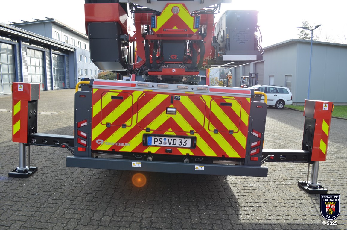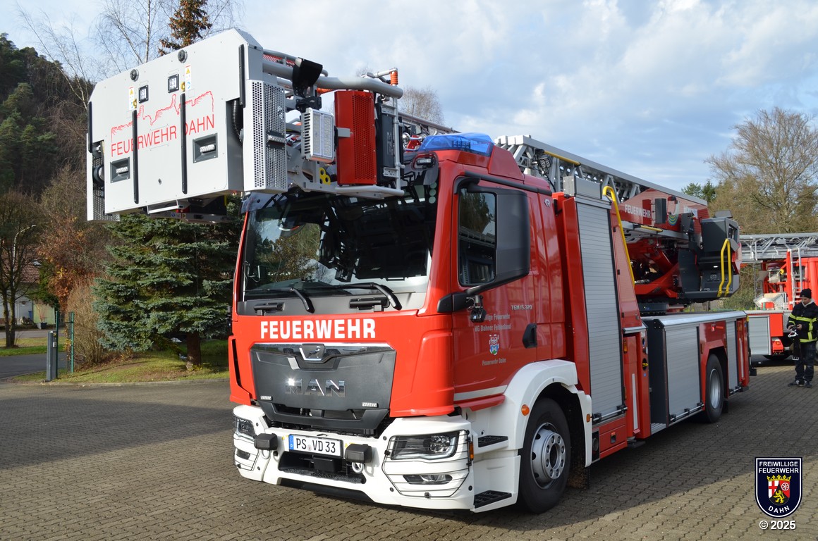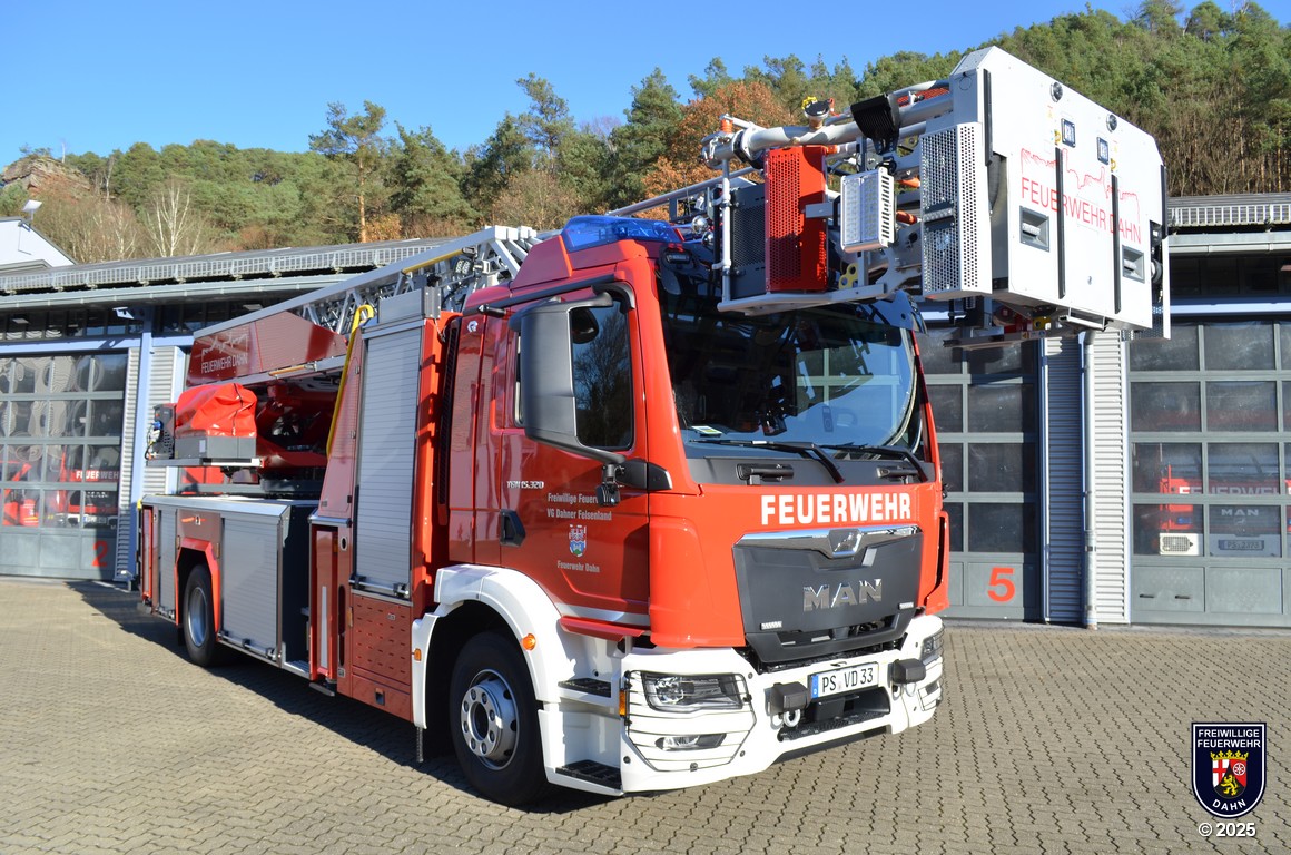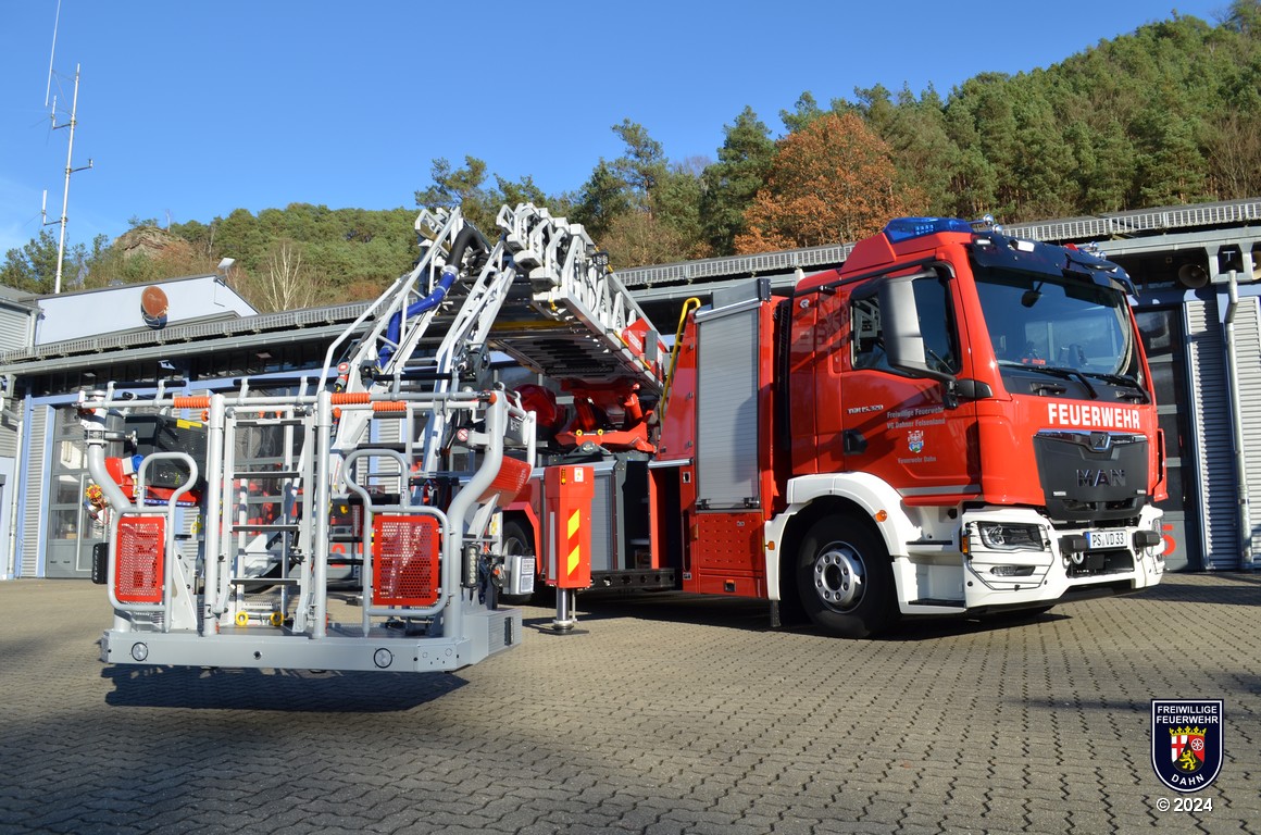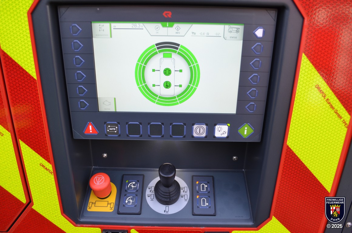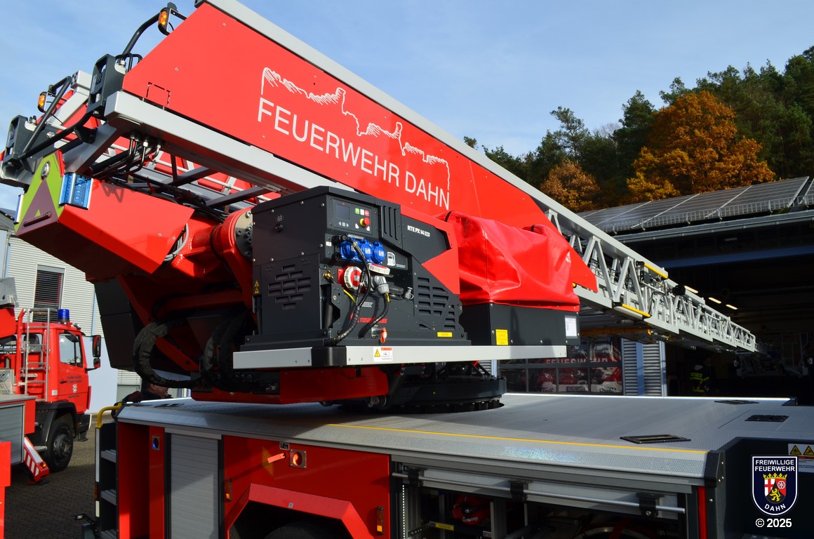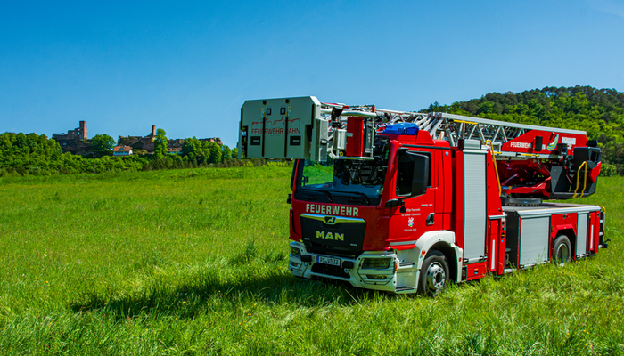 Angetrieben wird die DLK 23/12 der Feuerwehr Dahn von einem MAN Fahrgestellt mit Euro VI-Motor und 320 PS Leistung. Auf dem MAN-Fahrgestell wurde ein Aluminium Sicherheitspodium mit integrierter Beleuchtung aus LEDs, sechs Geräteräumen und zwei zusätzlichen Staufächern aufgebaut. Das Herz jeder Drehleiter ist natürlich der Leitersatz: In unserem Fall besteht er aus fünf Teilen inklusive abneigbarem Korbarm, wird mittels CAN-Bus-System gesteuert und ist mit einer 3D-Lastmessung ausgestattet, damit man permanent alle auf die Leiter wirkenden Lasten und Kräfte im Blick hat. Die maximale Arbeitshöhe beträgt 32 Meter, die Korbbodenhöhe in voll ausgefahrenem Zustand 30,3 Meter.