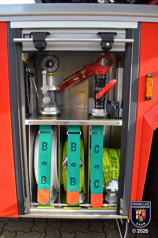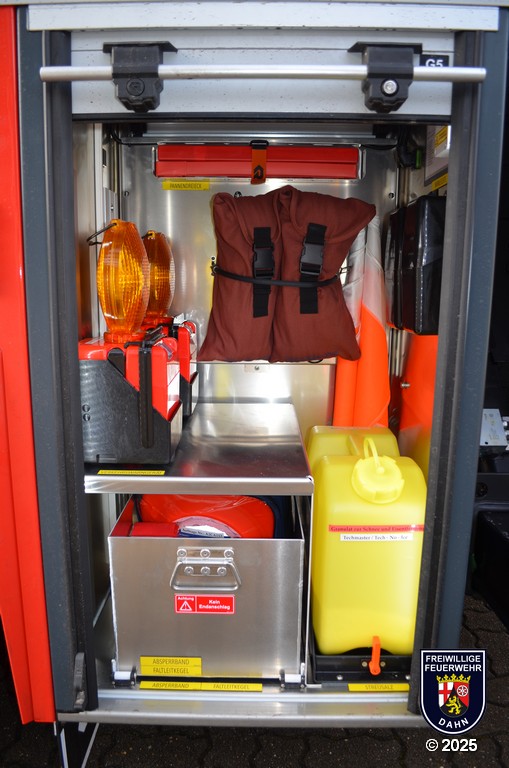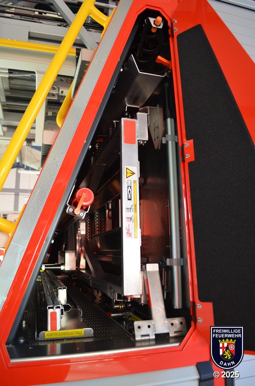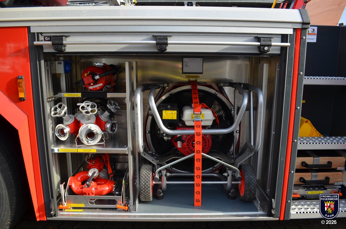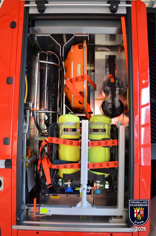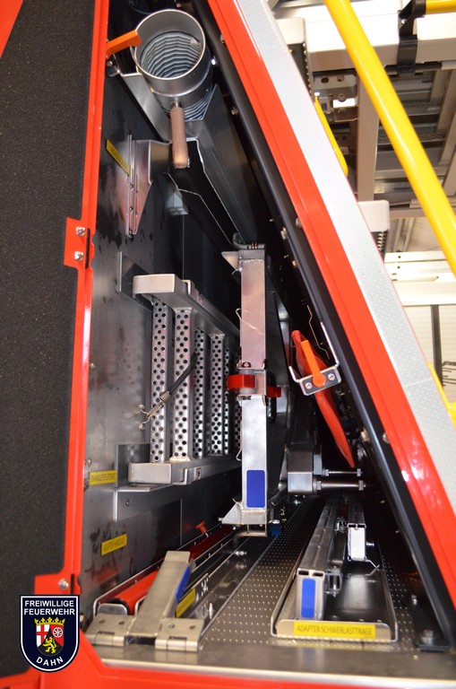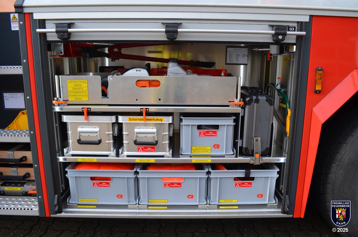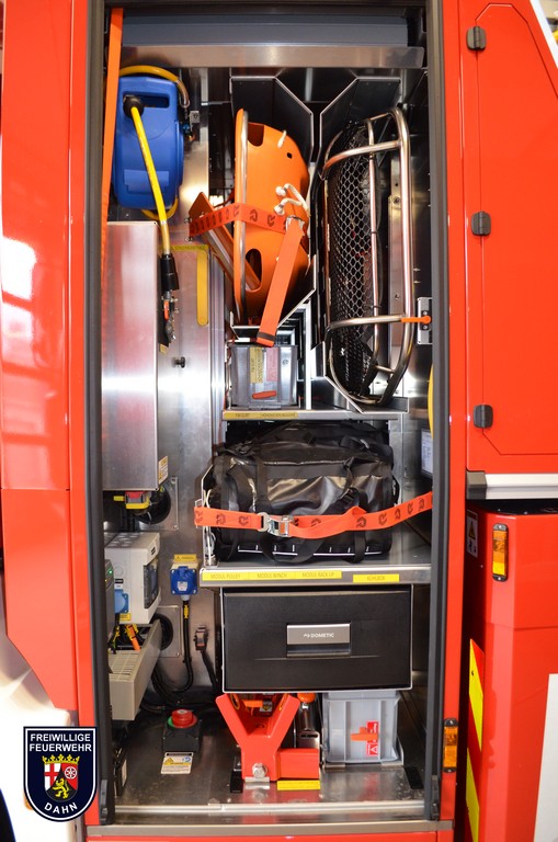 In den Geräteräumen befinden sich neben zuvor erwähnten dem Korbzubehör zwei Pressluftatmer, eine Elektro-Kettensäge Stihl MSE 250-C und ein Lüfter Leader MT-245. Zur Rettung von Personen aus Höhen und Tiefen wird ein Modul Pulley/Winch/Back up-System mitgeführt.