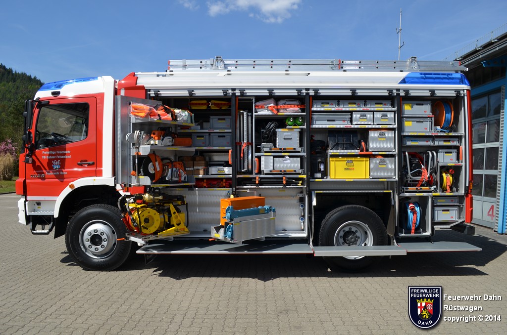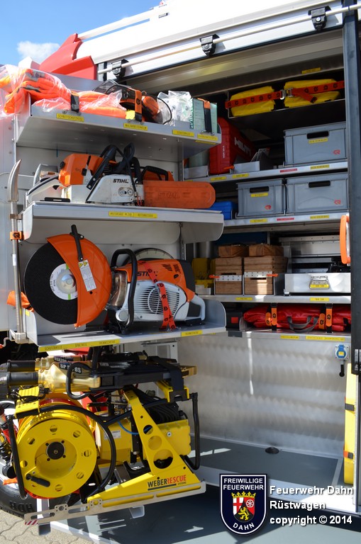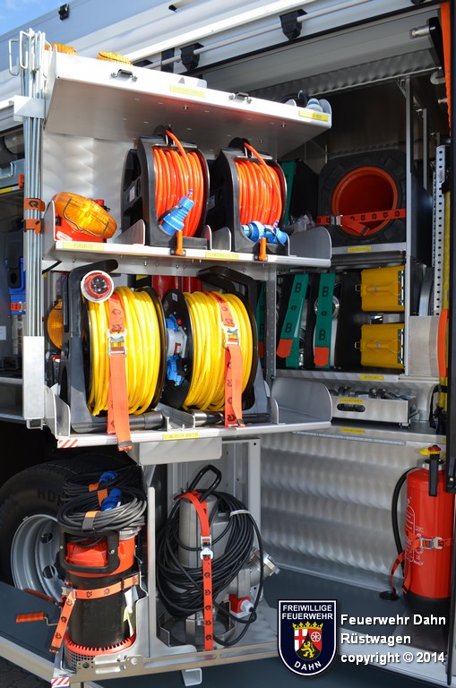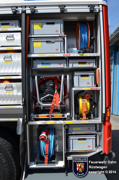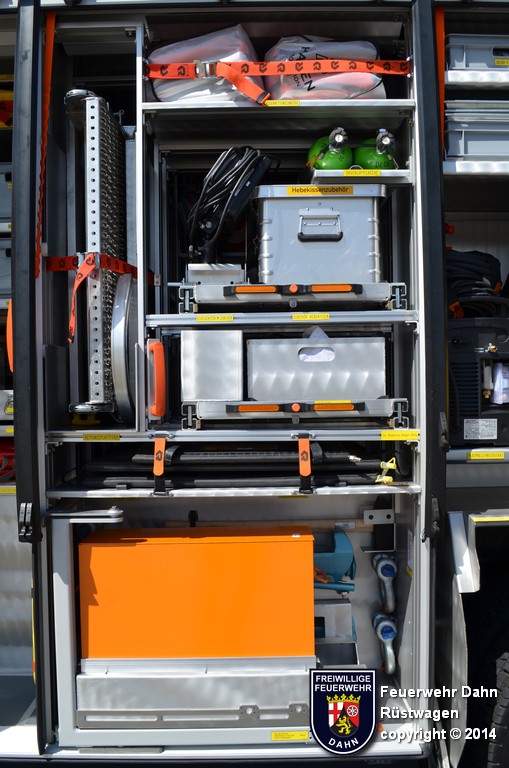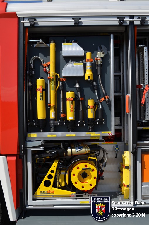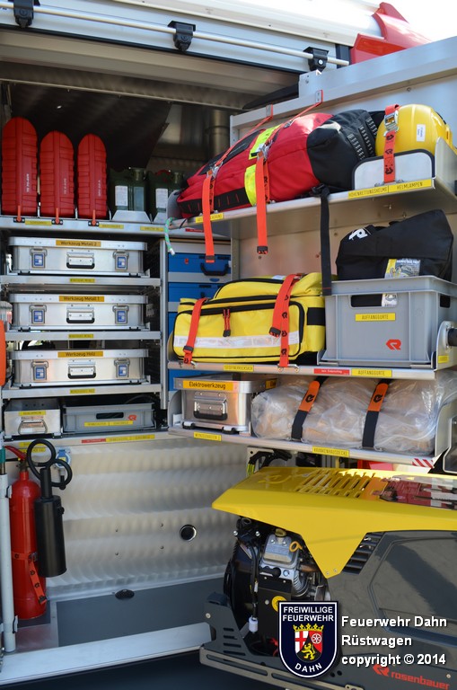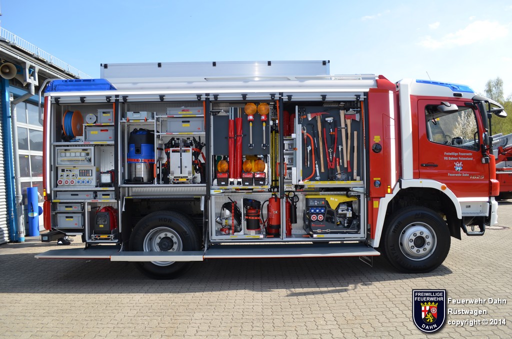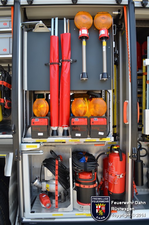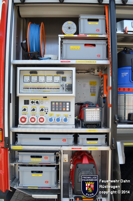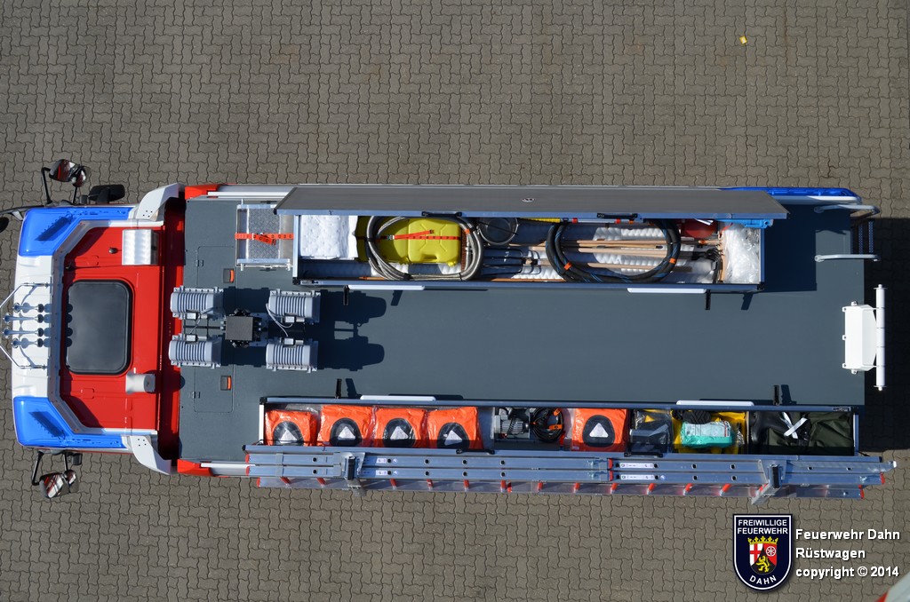Der Rüstwagen transportiert eine Vielzahl von Ausrüstung und Gerätschaften zur Technischen Hilfeleistung, z. B. nach Verkehrsunfällen, Maschinenunfällen, Notfalltüröffnungen, bei Einsturzgefahr oder Unwetter. Das Fahrzeug verfügt über eine umfassende Beleuchtung, die komplett in LED ausgeführt ist. Dazu zählen neben den Blaulichtern die Geräteraumbeleuchtung und die Umfeldbeleuchtung. Auch auf dem pneumatisch ausfahrbaren sind vier LED Strahler mit je 60 Watt-Leistung verbaut.