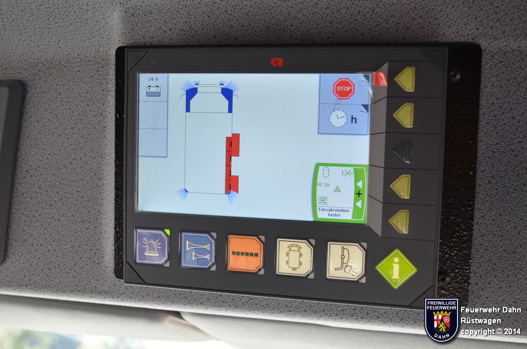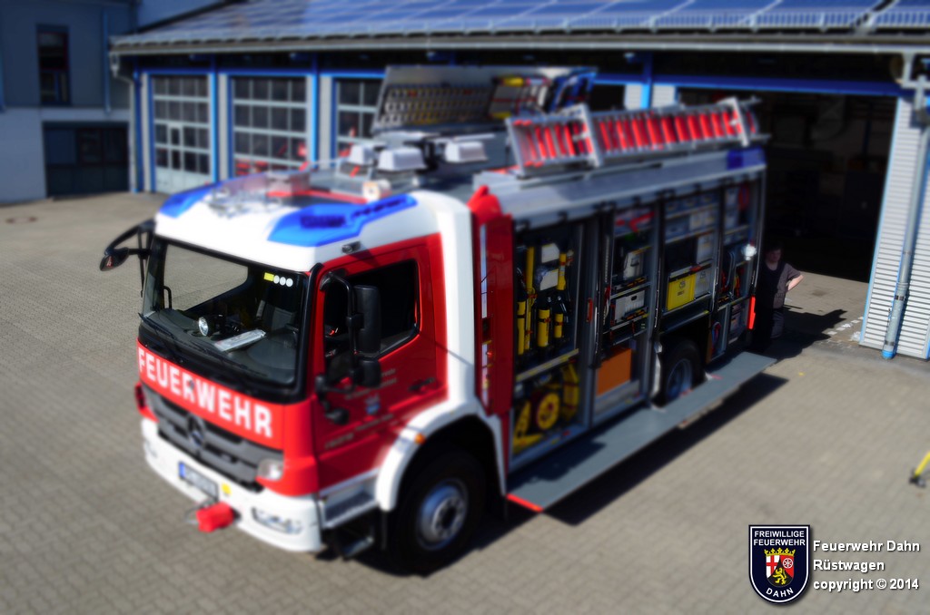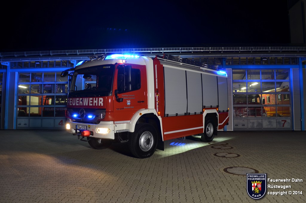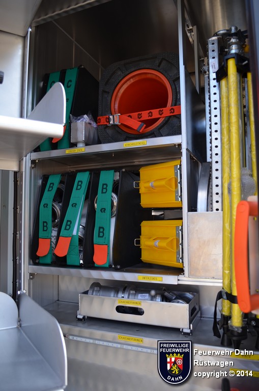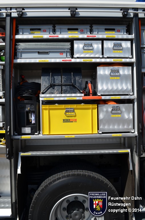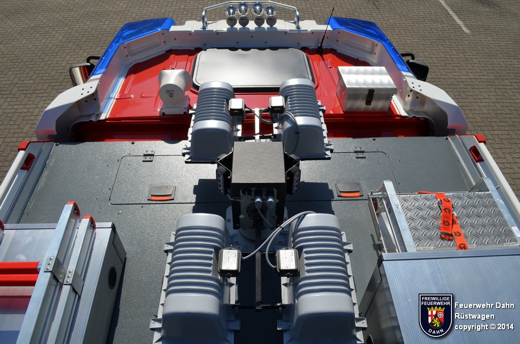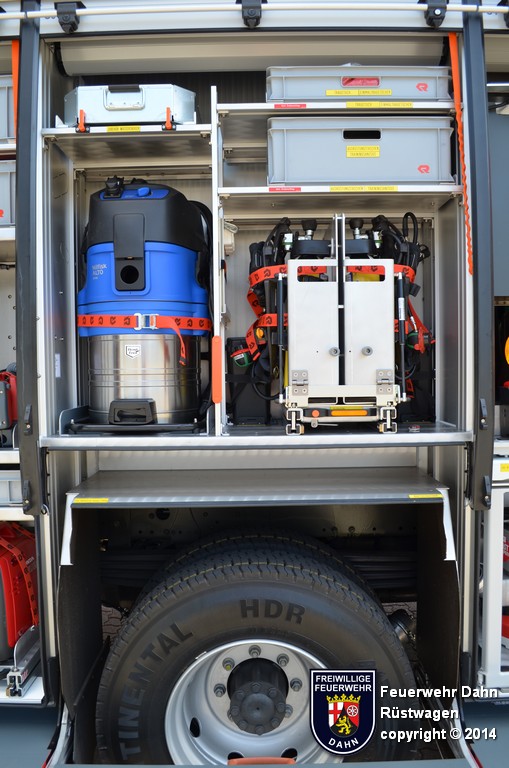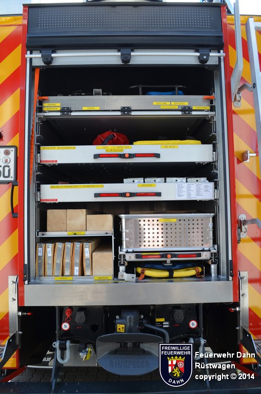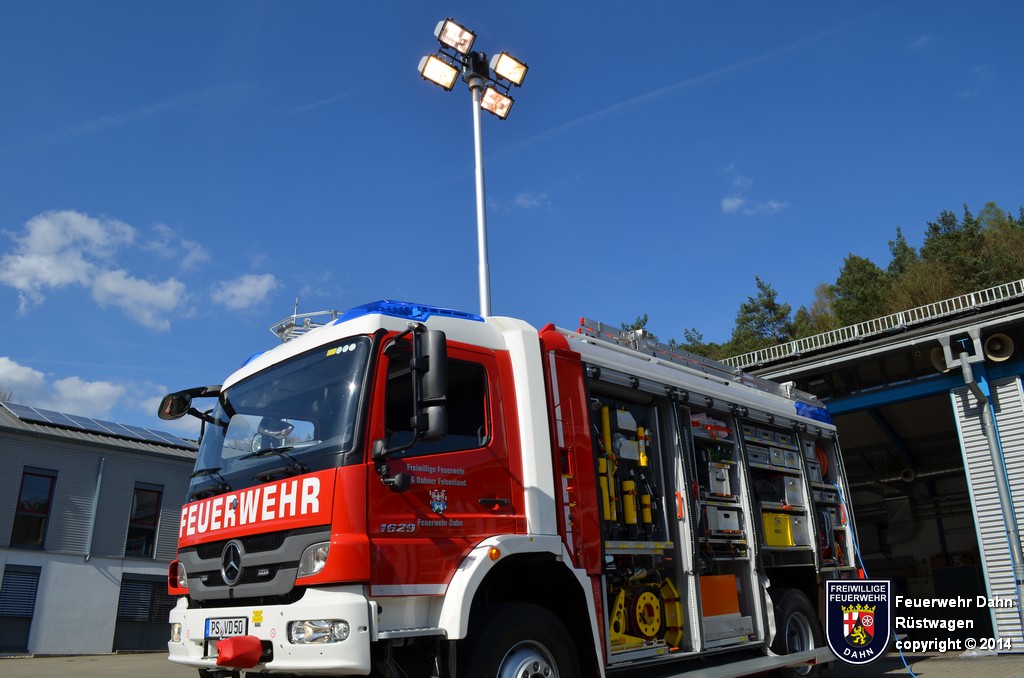Der Rüstwagen transportiert eine Vielzahl von Ausrüstung und Gerätschaften zur Technischen Hilfeleistung, z. B. nach Verkehrsunfällen, Maschinenunfällen, Notfalltüröffnungen, bei Einsturzgefahr oder Unwetter. Das Fahrzeug verfügt über eine umfassende Beleuchtung, die komplett in LED ausgeführt ist. Dazu zählen neben den Blaulichtern die Geräteraumbeleuchtung und die Umfeldbeleuchtung. Auch auf dem pneumatisch ausfahrbaren sind vier LED Strahler mit je 60 Watt-Leistung verbaut.