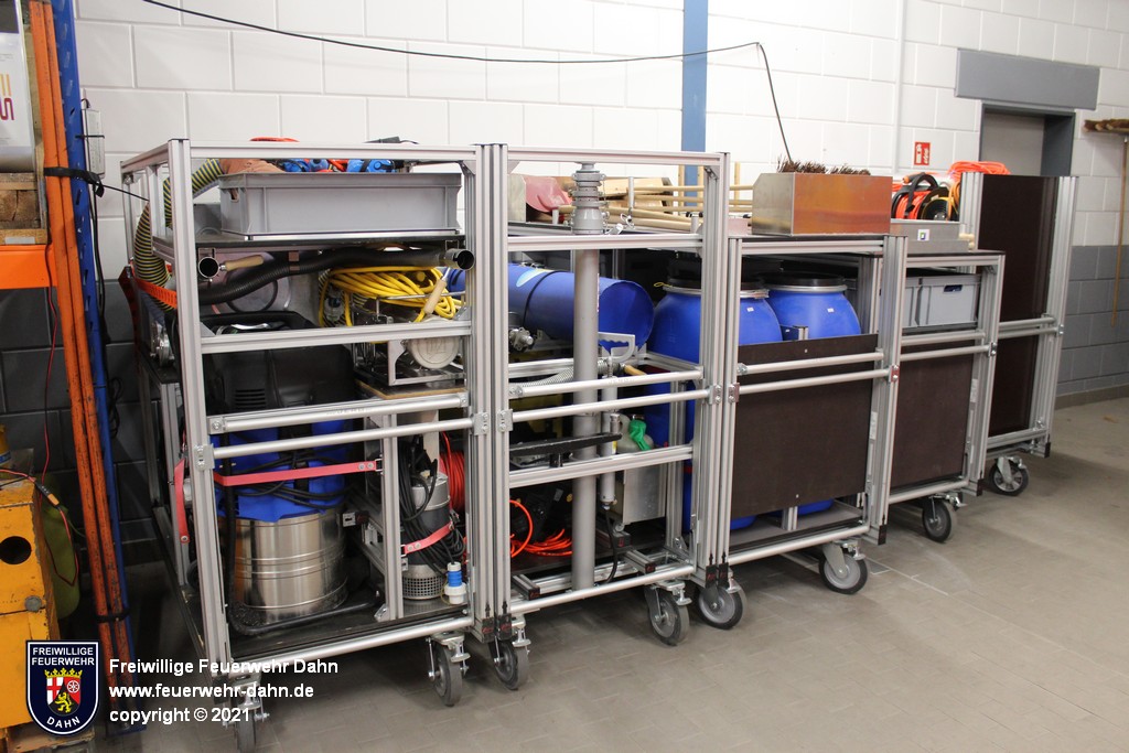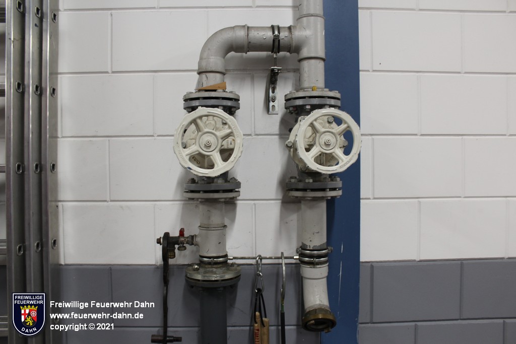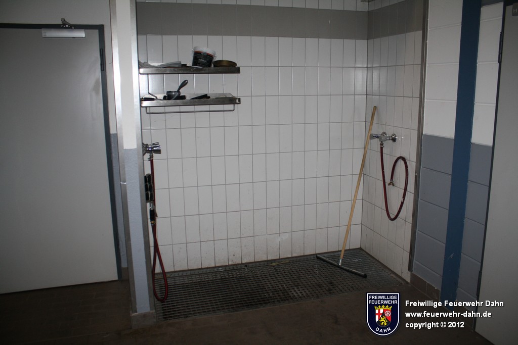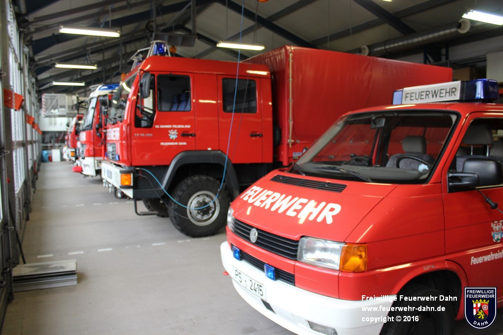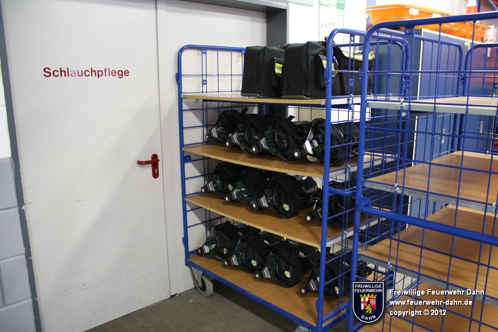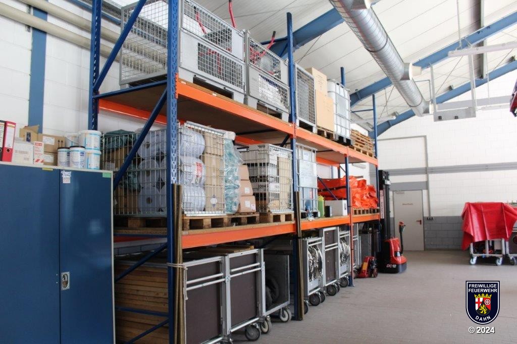 ...in den Fahrzeugen (12 Volt oder 24 Volt) erhalten wird sowie einen Anschluss an den Druckluftkompressor, mit dem der Bremsdruck in den mit Luftdruckbremsen ausgerüsteten Fahrzeugen konstant gehalten wird. An der Rückwand der Fahrzeughalle ist zum einen ein Wasseranschluss installiert, über den die Löschfahrzeuge mit 2B-Anschlüssen nach Einsätzen wetterunabhängig wieder befüllt werden. Zum anderen ein Hochregallager, auf dem diverse Materialien gelagert werden, u.a. ein 1000 Liter Schaummittelbehälter, Ölsperren, Tische und Bänke. Darunter stehen die Gerätesätze und Rollcontainer, die im Bereich "Geräte" angeschaut werden können.