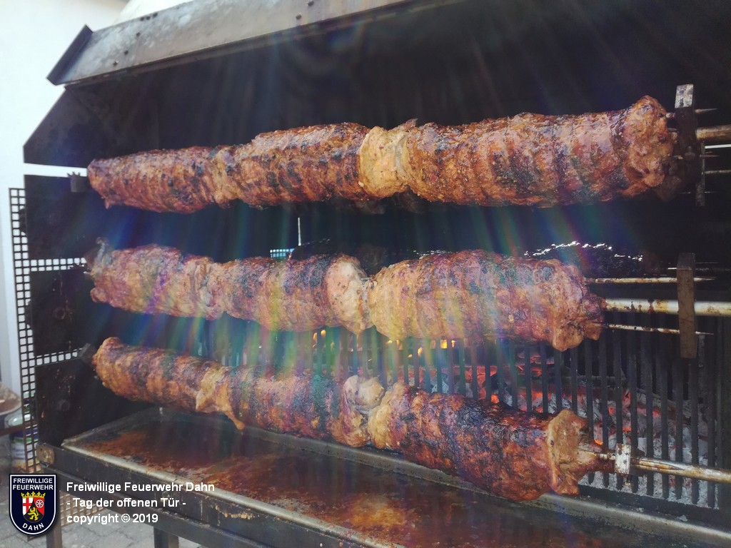 Unsere Gäste wurden vom Küchenteam der Feuerwehr Dahn mit einem reichhaltigen kulinarischen Angebot verwöhnt, welches von Kaffee und Kuchen über Currywurst, Pommes, Steaks bis hin zum traditionellen Rollbraten vom Holzkohlegrill mit Bratkartoffeln und Salatteller reichte. Auch der Flammkuchenstand war gut besucht.